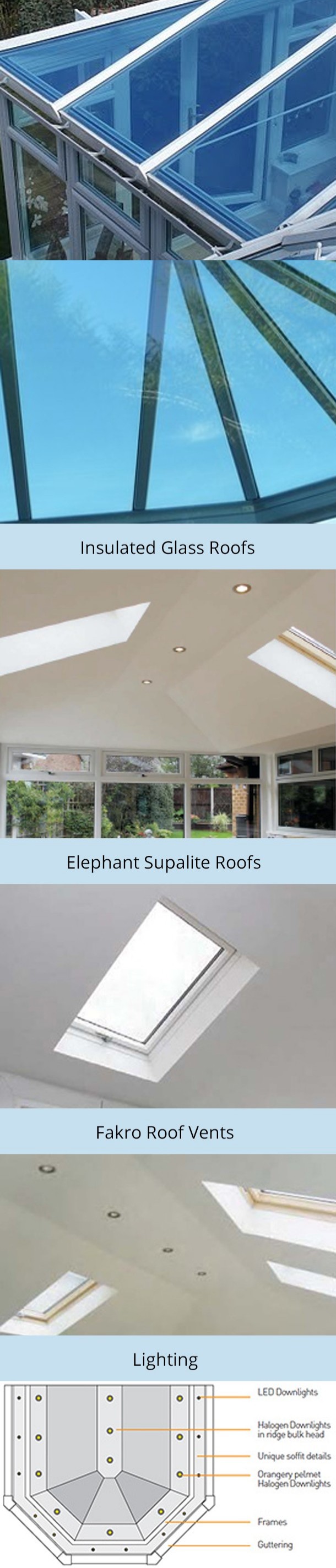 The glass panels can be inserted to replace any of the aluminium roofing panels, in any shape enabling you to maximise the light in your room or produce a very contemporary design not easily achievable with other types of roofing system.