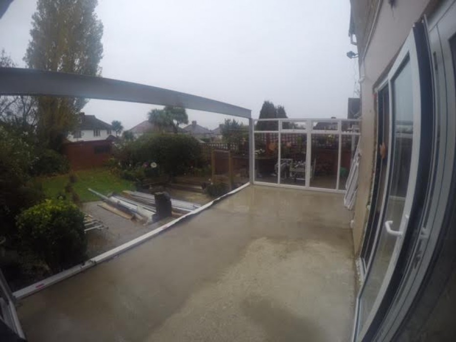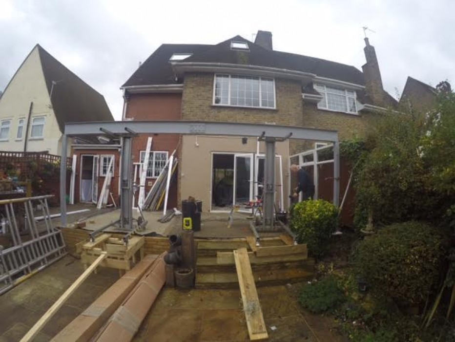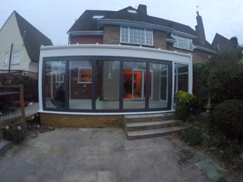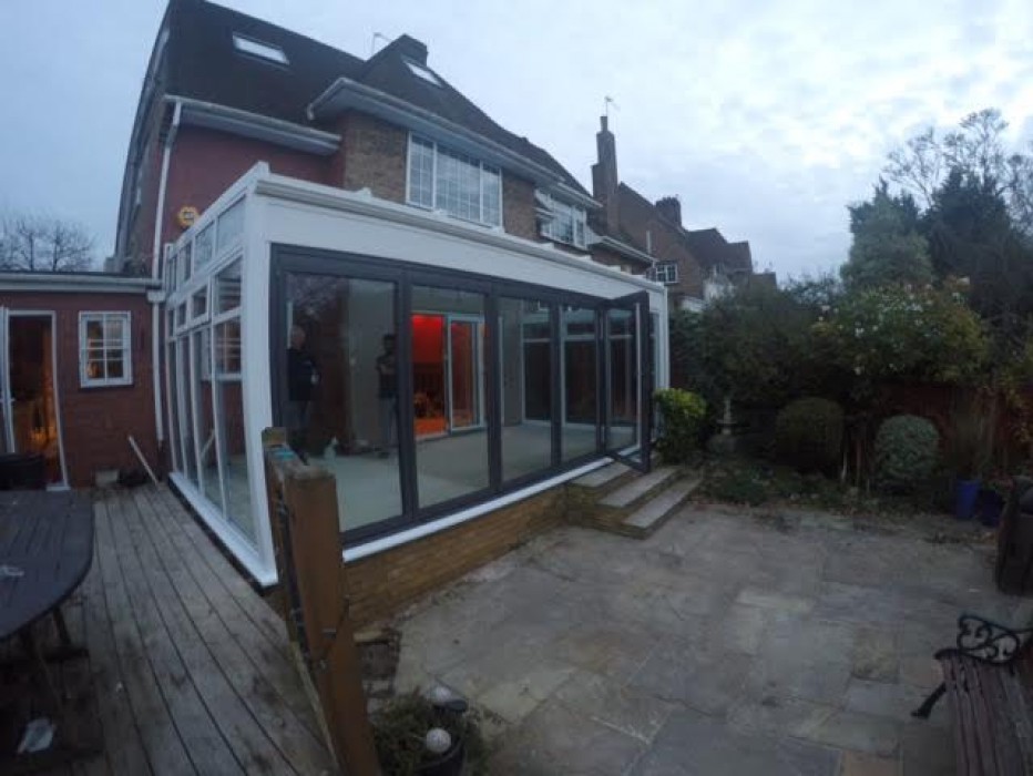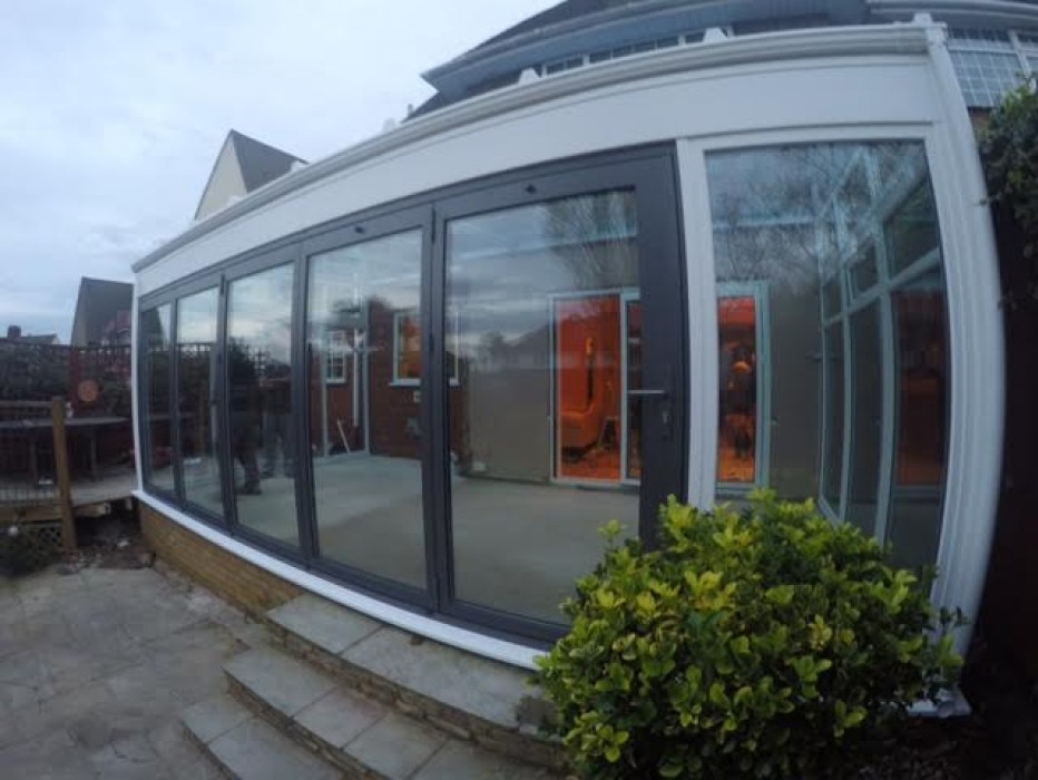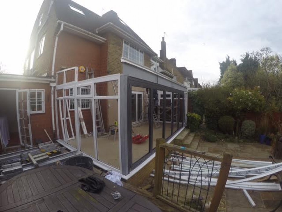 Stage by stage installation of recently fitted conservatory. White PVCu frames and self cleaning glass roof with a RAL7016 5 pane SunParadise aluminium bi-fold doors and structural steel work to the front